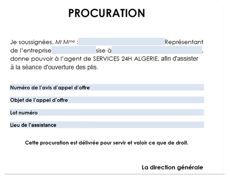 Nous avons besoins d’une procuration de dépôt de soumission (modèle ci-joint).