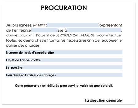 Pour le retrait d’un cahier des charges nous avons besoin de l’avis d’appel d’offre ainsi qu’une procuration (ci-joint un modèle), que vous nous renverrez par fax ou par email dûment rempli, cacheté, et signé, ces deux documents sont indispensables afin de procéder au retrait.