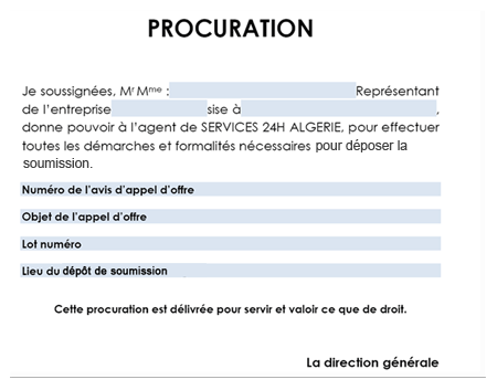Nous avons besoins d’une procuration de dépôt de soumission (modèle ci-joint).