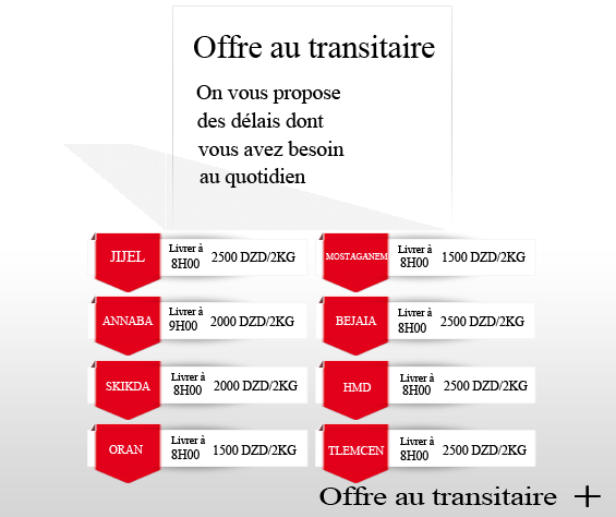 Carte réseau :SERVICES 24H ALGERIE coopère avec des transitaires nationaux et des courtiers en douane agissant au niveau national elle offre les meilleurs délais pour la livraison de tous les points transites et disponible à tous-moment pour le ramassage. SERVICES 24H ALGERIE vous propose les meilleurs délais.Heures de livraison par destination :